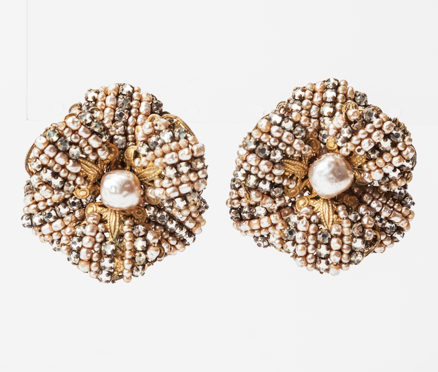 Miriam Haskell’s large and dimensional floriform ear clips. Each is composed of six petals of gilt filigree, hand sewn with faux baroque seed pearls and crystal rose montes. Signature faux baroque pearl in center. Clip back fittings. Elegant timeless earrings. 1950’s USA. Excellent condition.