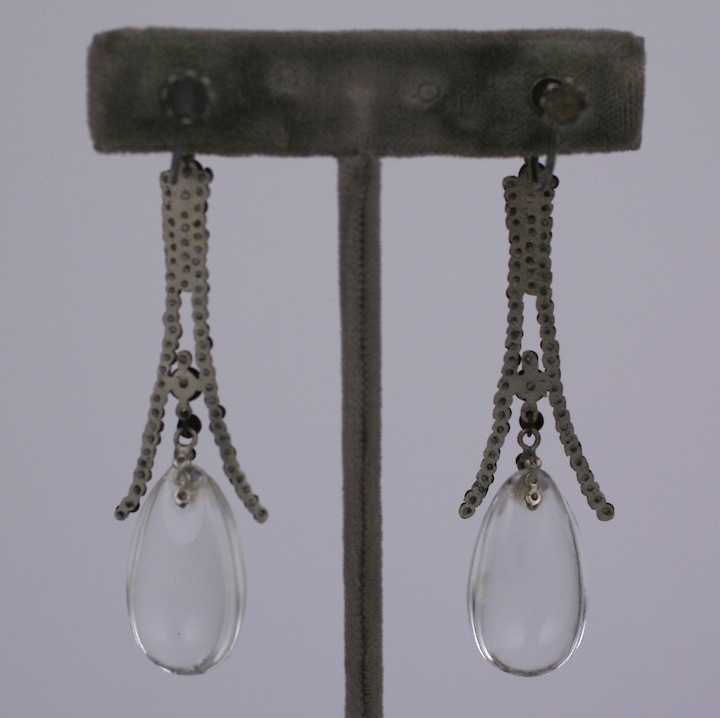 Unusual Cut Steel and Rock Crystal Earrings from the early decades of the 20th Century. Although very Art Deco in style, the use of the tiny cut steels gives the earrings a more 19th Century feel. Lovely and delicate juxtaposition of materials. Screw back fittings. France 1920. 3" x .75".