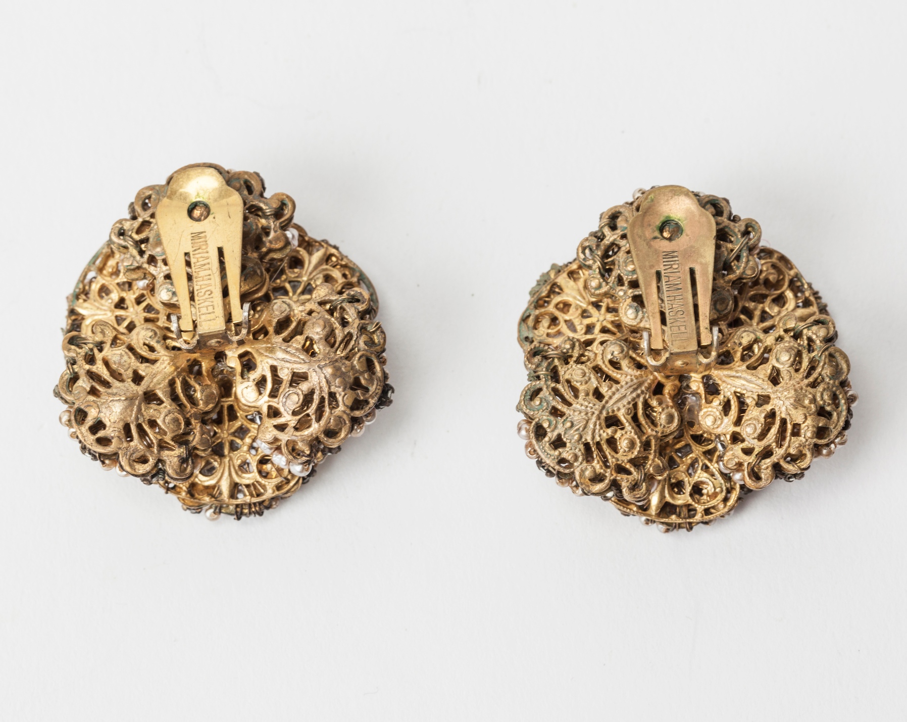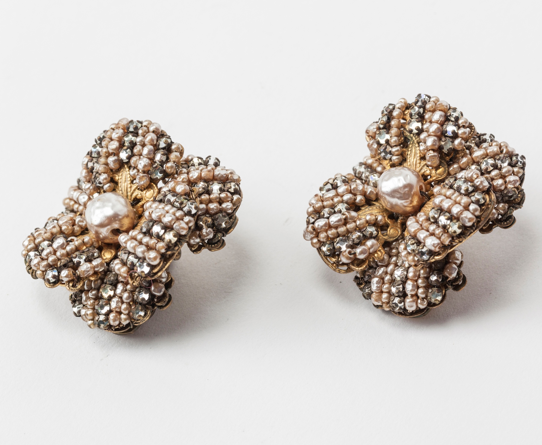 Miriam Haskell's large and dimensional floriform ear clips. Each is composed of six petals of gilt filigree, hand sewn with faux baroque seed pearls and crystal rose montes. Signature faux baroque pearl in center. Clip back fittings. Elegant timeless earrings. 1950's USA. Excellent condition.