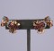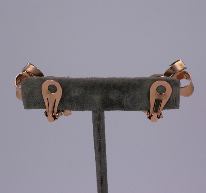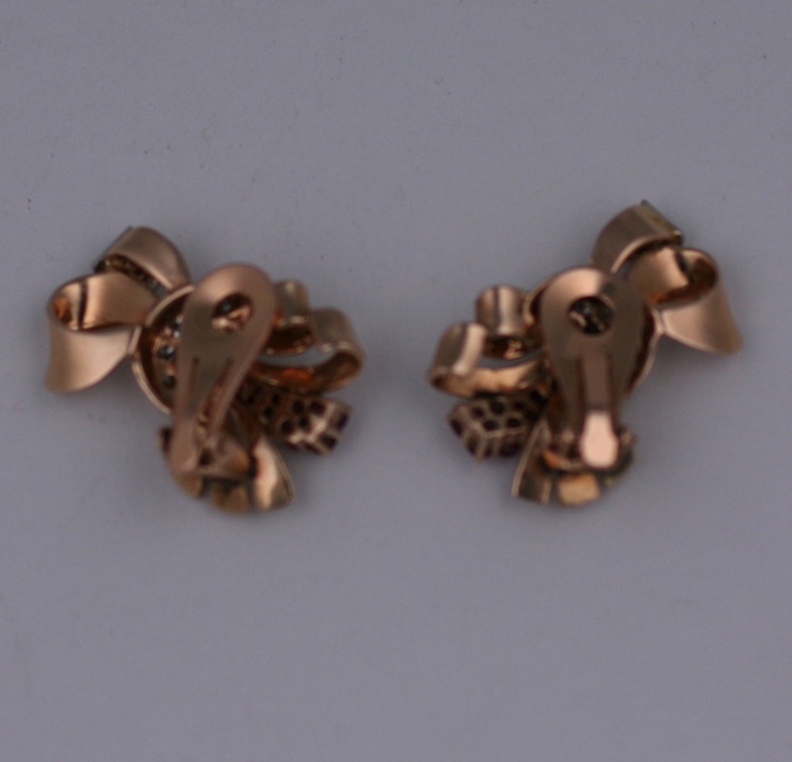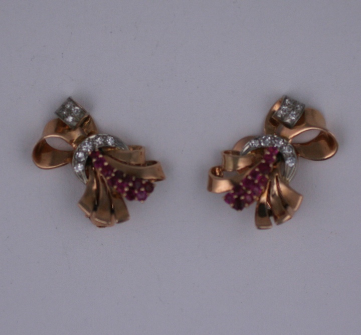 Retro ruby and diamond earrings set in 14k pink gold. Bow motifs sit diagonally up the ear. Clip back fittings. 1" x .75". 1940's USA. Excellent condition.