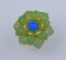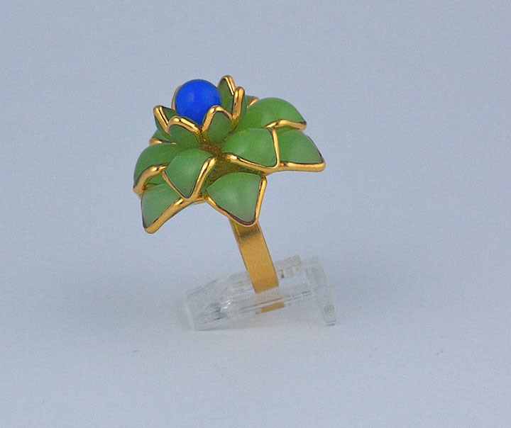 Handmade poured glass Zinnia ring by Mark Walsh Leslie Chin. Lime glass set within gilt metal settings. Dimensional ring w adjustable band. 1.25" flowerhead. Made in France.