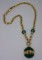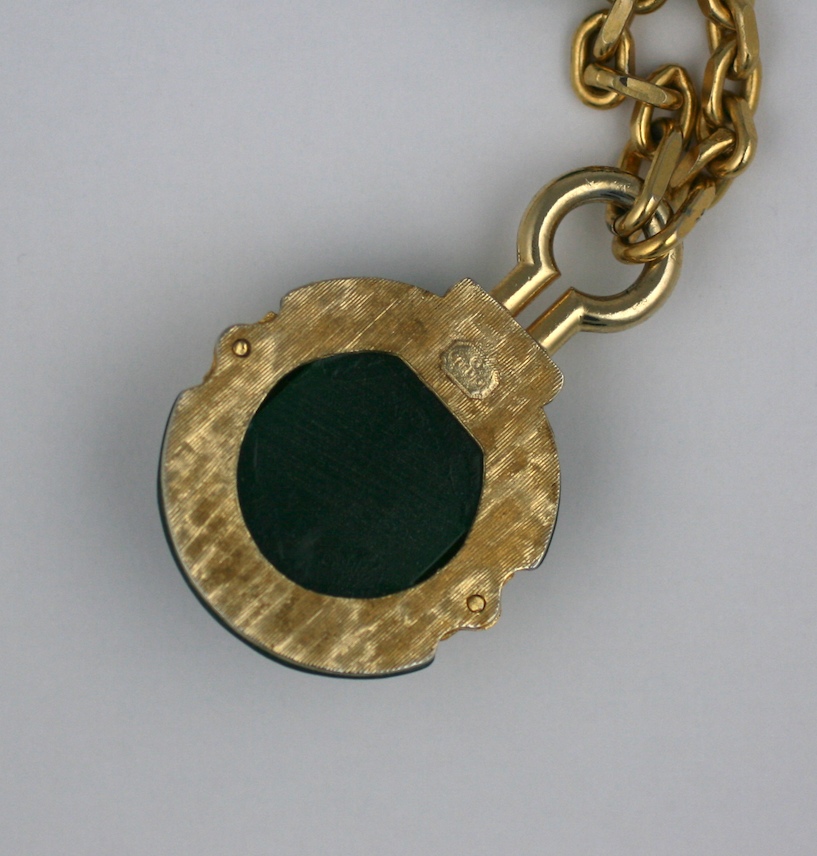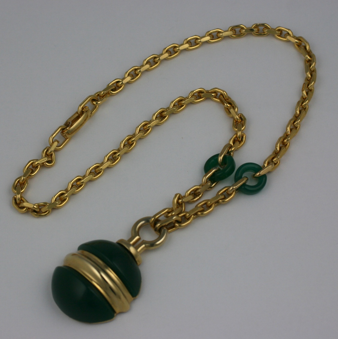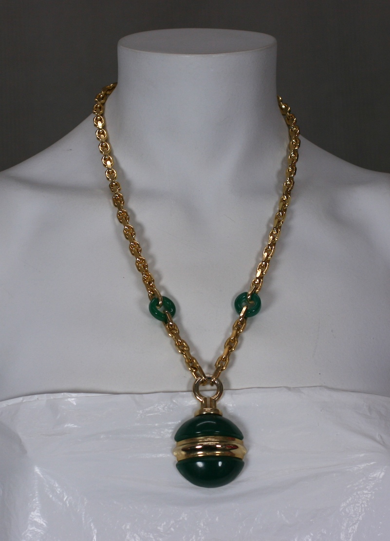 1970's Christian Dior Pendant in gilded metal and faux jade bakelite. Large domed pendant hangs from chunky gilt chaining signed by Grosse who manufactured for Dior in the 1960's and 70's. chain 20". Pendant 2.5" x 1.5". Signed Christian Dior. Excellent condition.