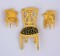 Playful iconic brooch and earring set by Karl Lagerfeld.Jet and crystal stones in matte gold settings. French lyre back chair with "KL" logo with matching side chair clip earrings. Cabochon crystals form armrests on earrings.