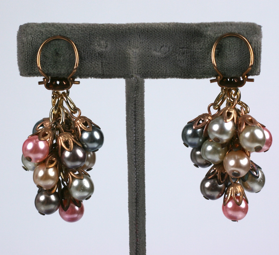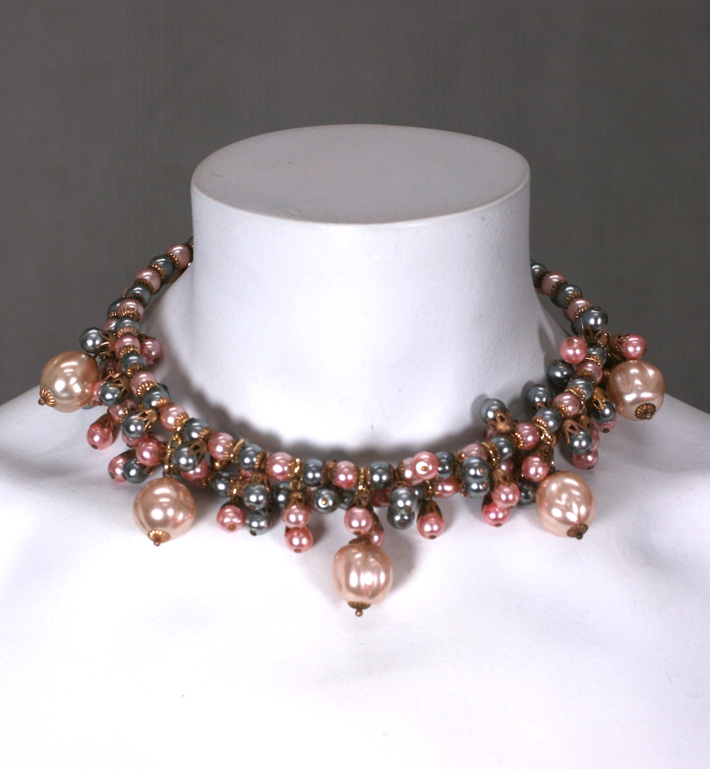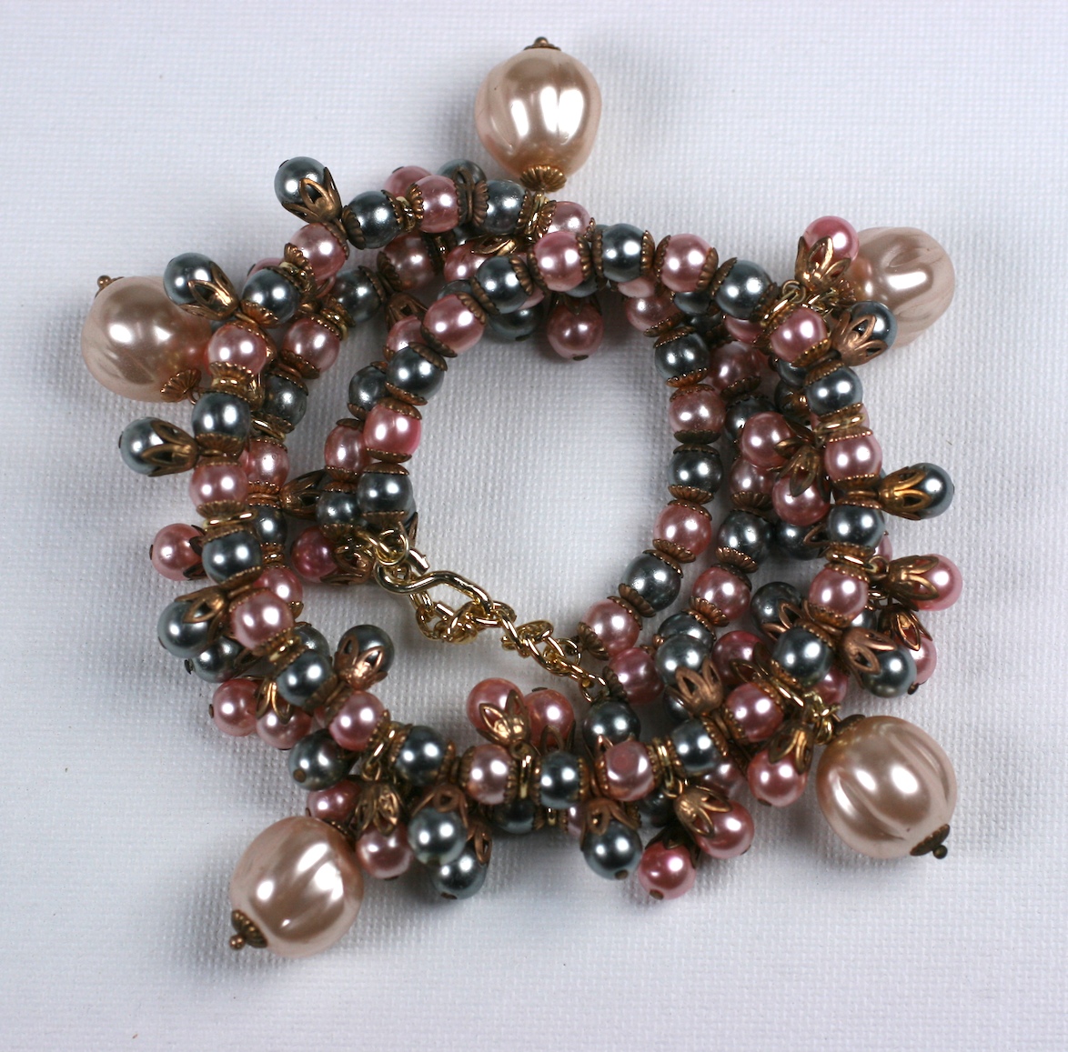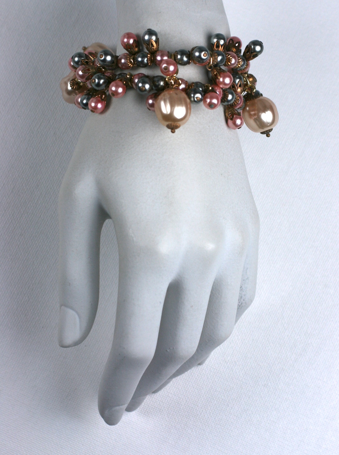 Louis Rousselet Parure of cream, pale pink and silver grey handmade signature Rousselet pearls. Comprising a two strand flexible necklace on metal wire, a two strand flexible wrap bracelet and long pearl cluster earclips.