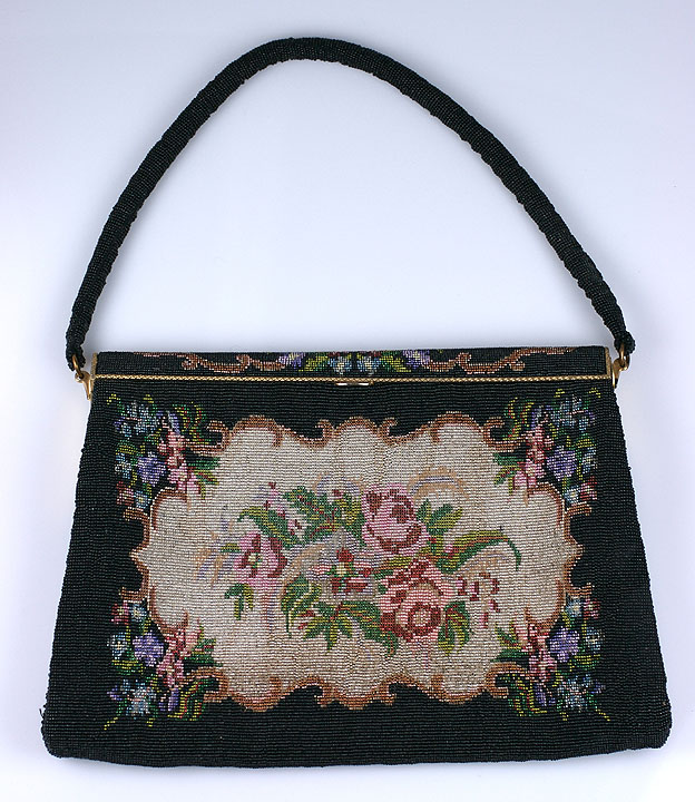 Intricately hand beaded purse made in France circa 1950s. Microfine cut steel beads are used instead of traditional glass beads which gives the effect of a metallic shimmer… very beautiful. Woven into the beadwork is a pattern of rose florals within a cartouche. Beaded clasp runs along the top of the entire purse with beaded handle.