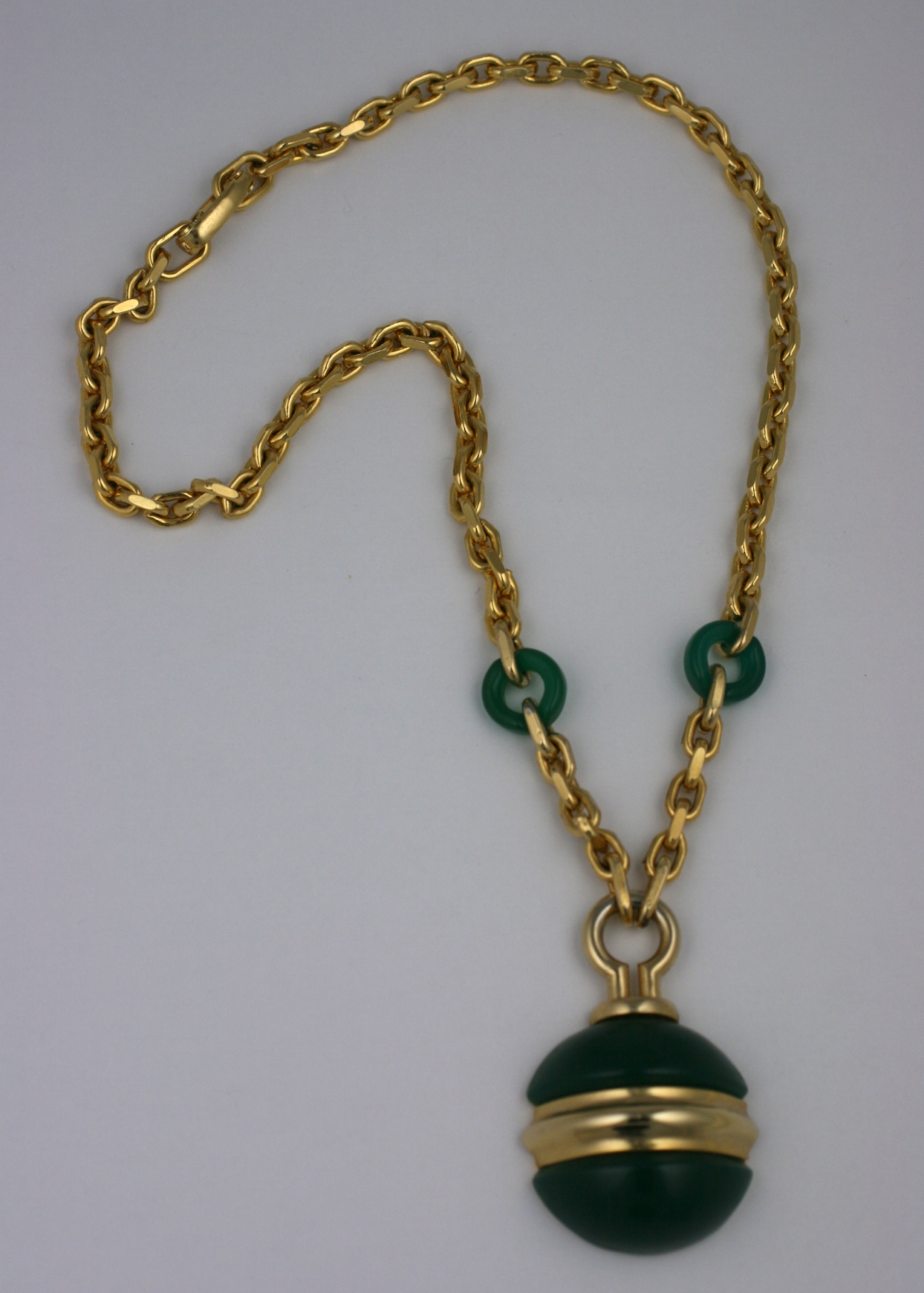 1970’s Christian Dior Pendant in gilded metal and faux jade bakelite. Large domed pendant hangs from chunky gilt chaining signed by Grosse who manufactured for Dior in the 1960’s and 70’s. chain 20″. Pendant 2.5″ x 1.5″. Signed Christian Dior. Excellent condition.