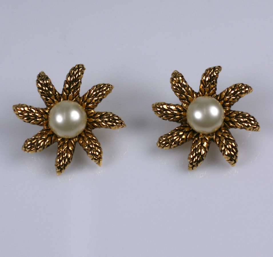 Chanel Star ear clips with wheat texture with a large handmade cocoa pearl by Maison Gripoix. France 1980’s. 1.75″ diameter. Excellent Condition