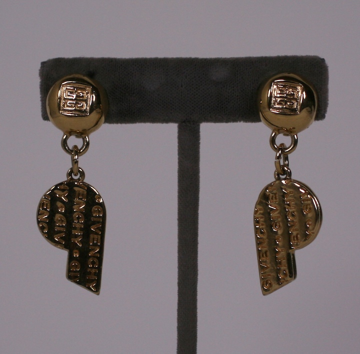 Charming earrings with “whistle” shaped drops by Givenchy,Paris. The house logo is on the ear clip and emblazoned on the whistles. 1980’s France.