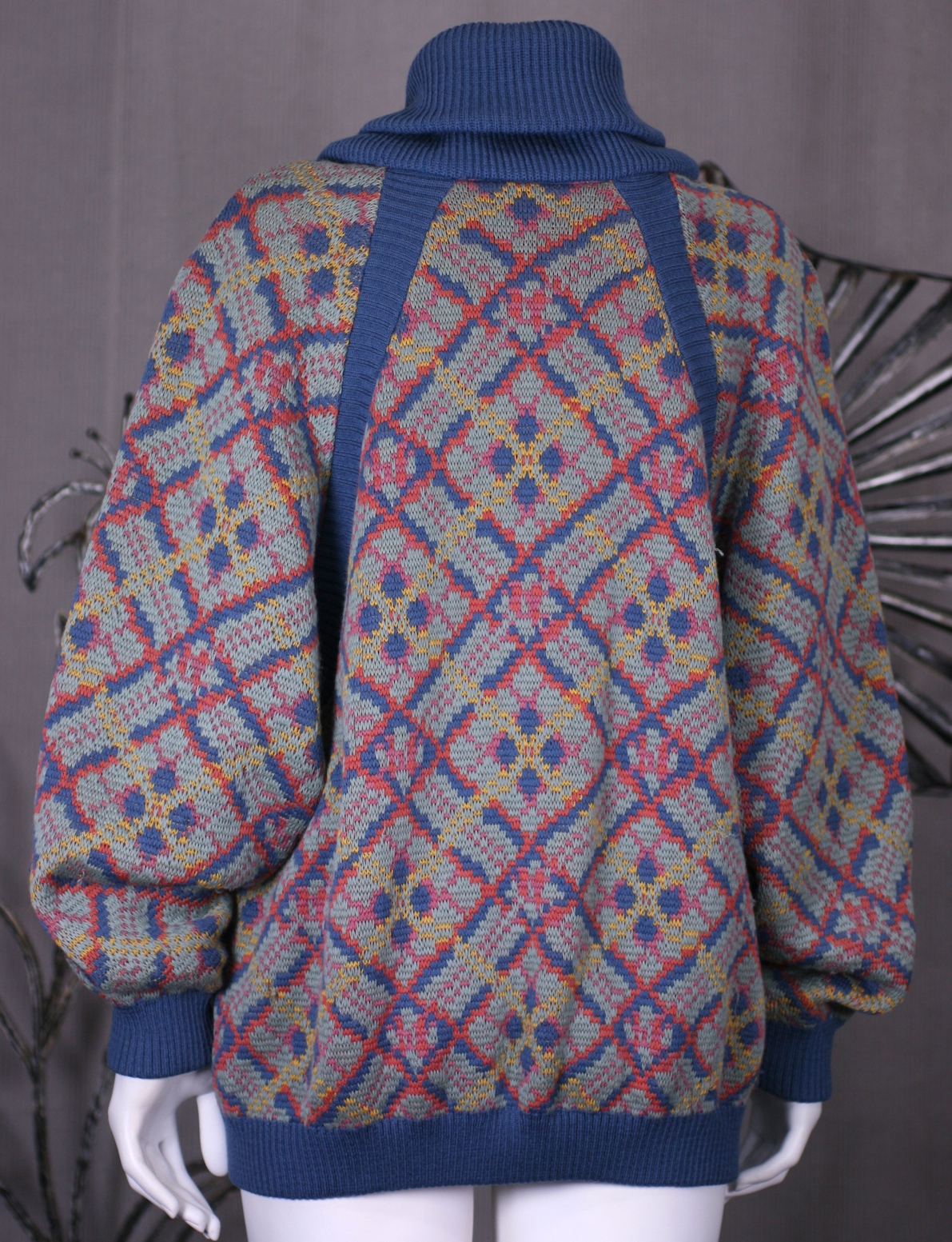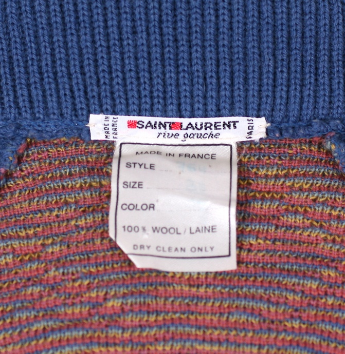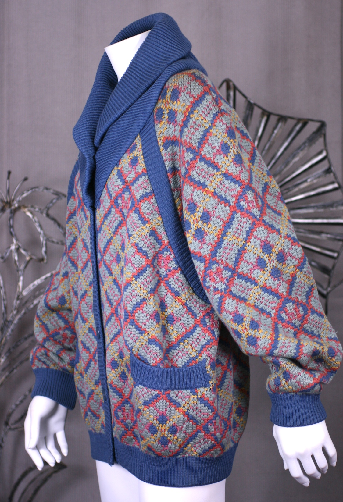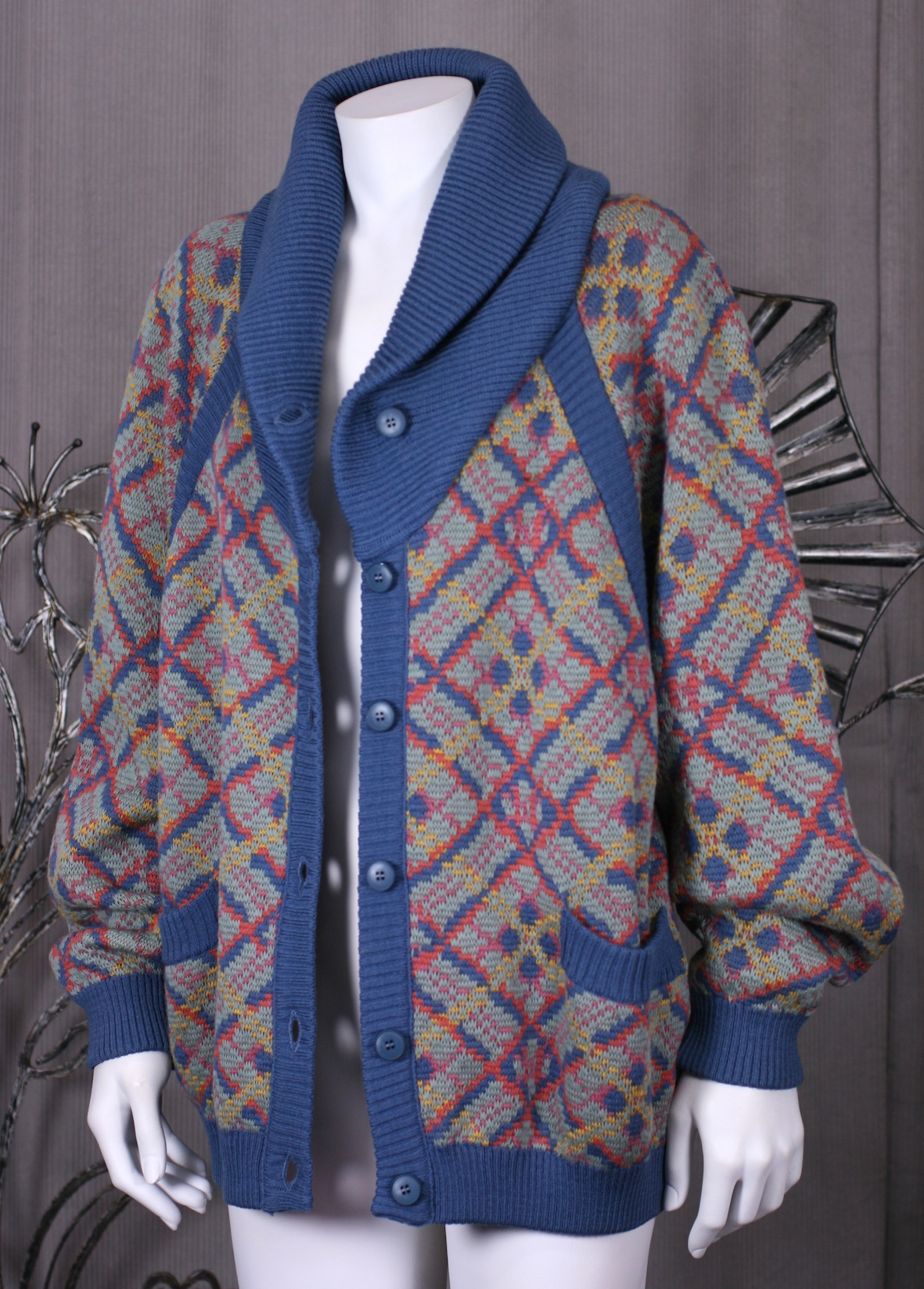 YSL Rive Gauche wool argyle intarsia knit cardigan inserted with slate blue ribbed knitted bands and pockets. There is a blue ribbed knitted shawl collar, placket and deep raglan sleeves. 1980's France. Excellent condition.
