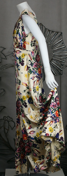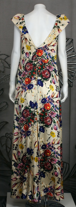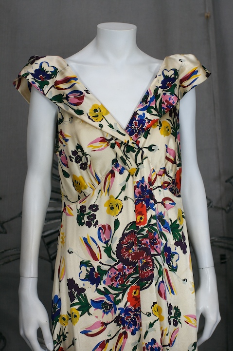 Colorful floral silk satin 1930s gown with large bias sweep. Collar extends over shoulders and is tucked to form shoulder "wings" and give structure to this soft dress. Shirred details under bust and self covered buttons all along the center back. Excellent condition.