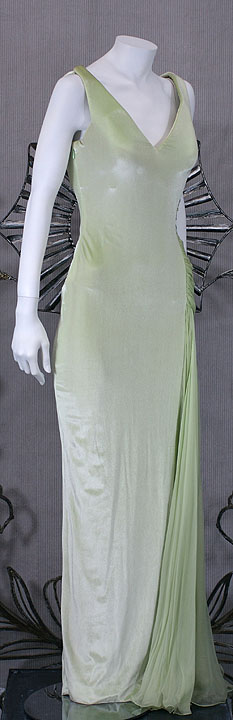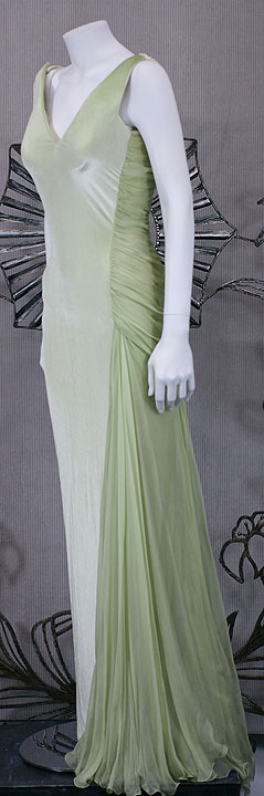 Versace goddess gown in stretch silk velvet with ruched side panel of silk chiffon and floating panels on one side. Built in shaped bodice.