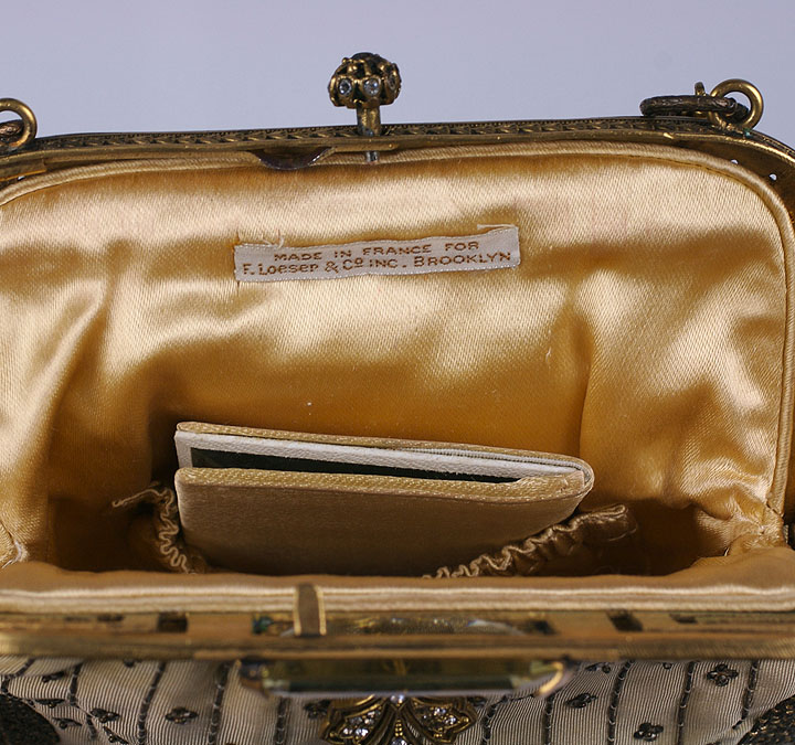 Eygptian revival butter silk faille with scarab tinsel embroidery in silver and gold threads. Large emerald cut citrine paste and clear stones set into frame. Beautiful quality imported from France for a NY store circa 1920s.