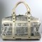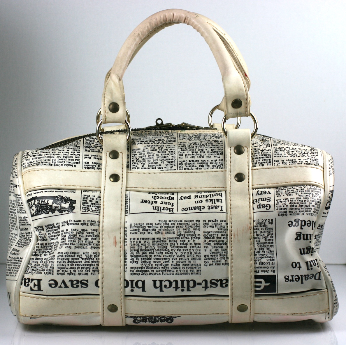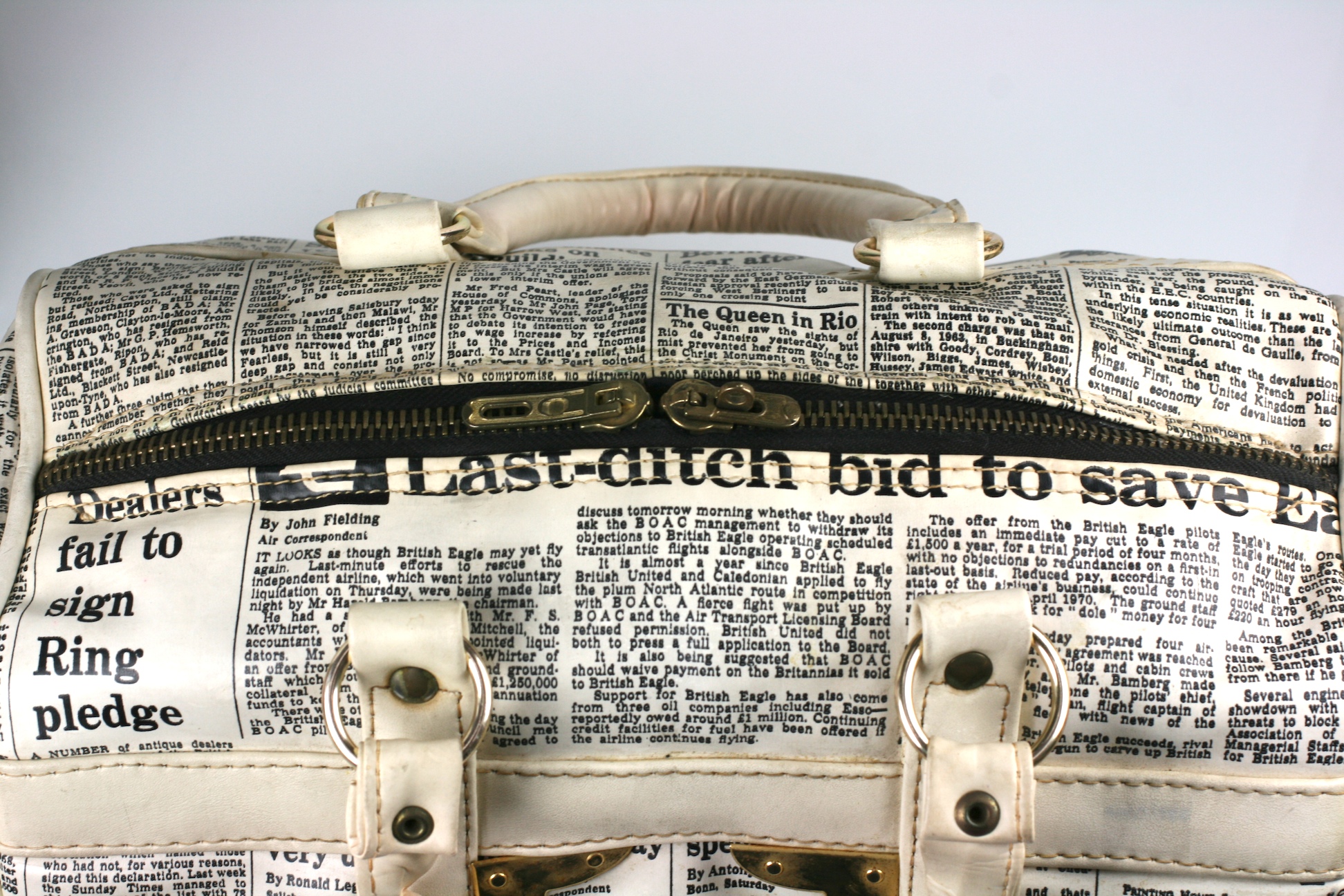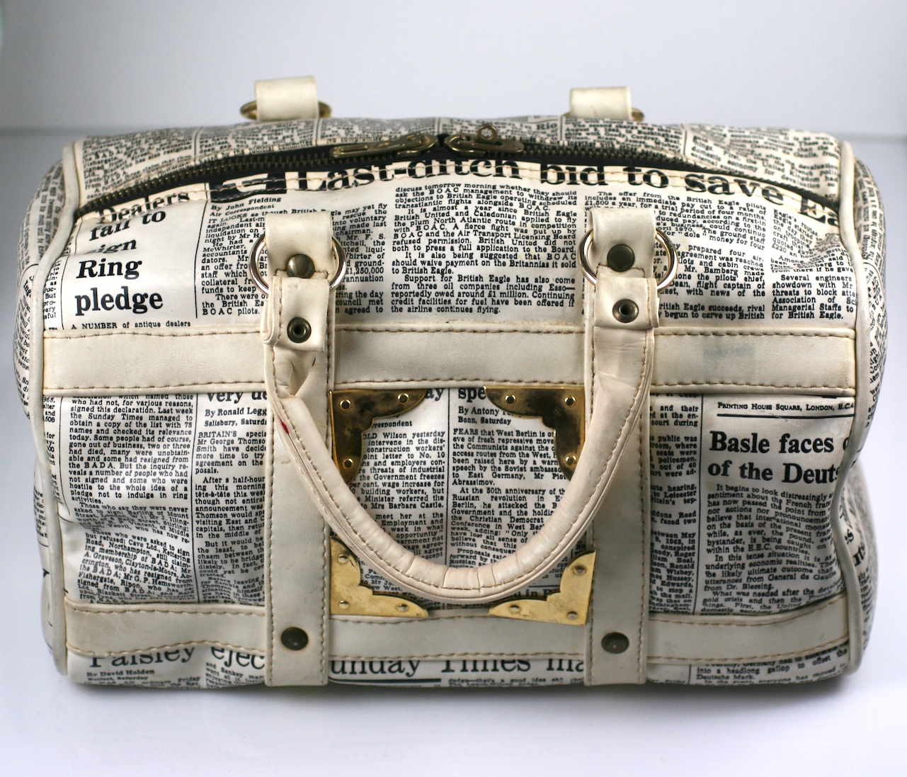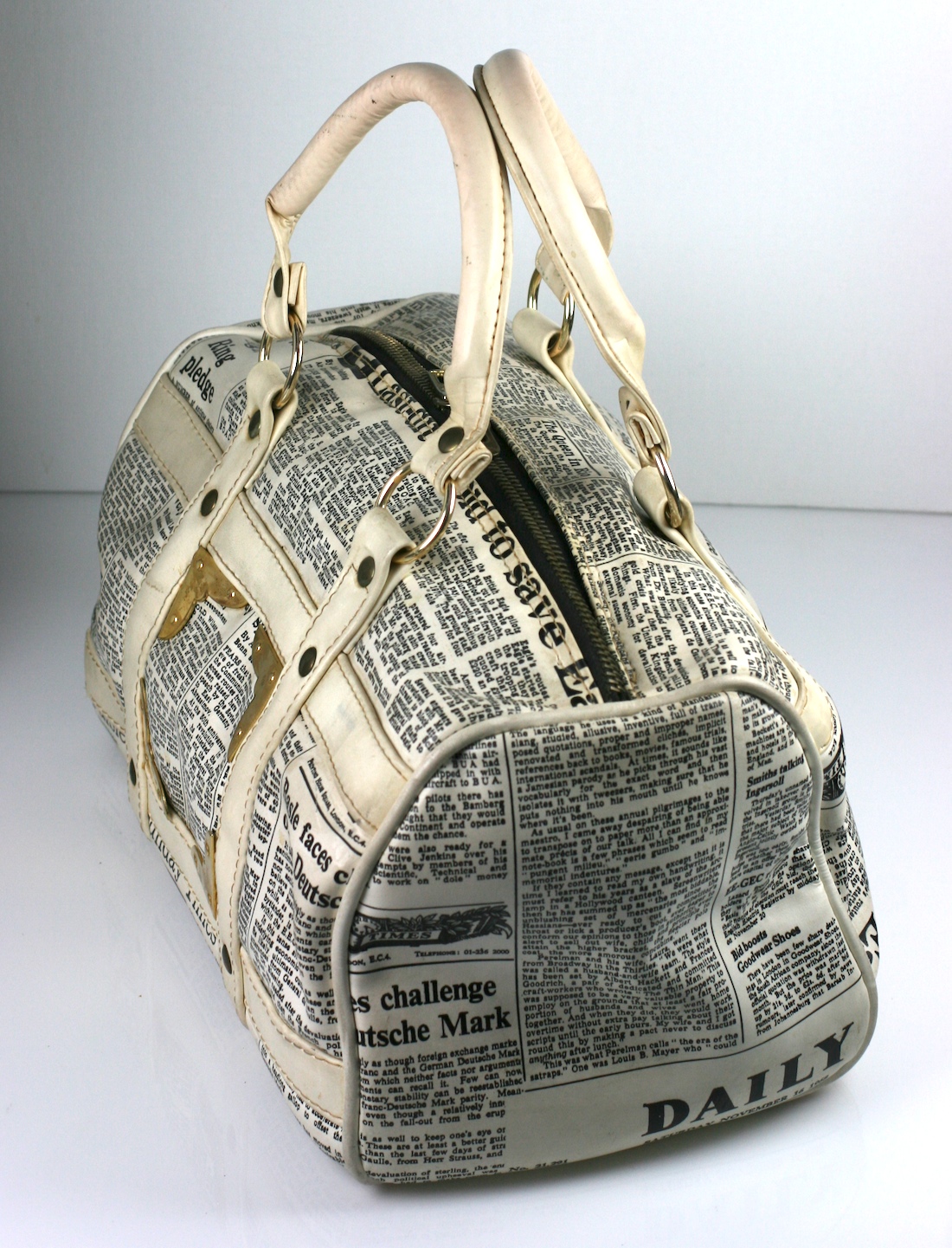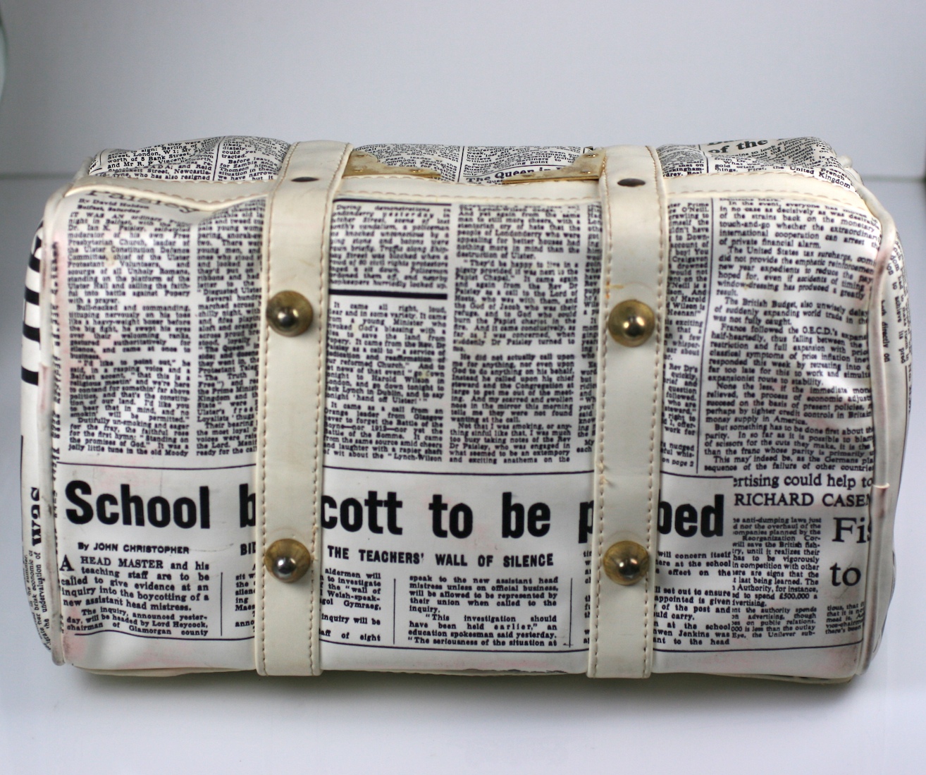 Unusual vinyl satchel made in the 1960's with newsprint articles from the UK. One article is from the "Daily, dated Nov. 16, 1968".