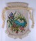 Incredible micro seed bead bag with figural panels of swans in floral beaded vignettes. The background is a pale pearly microbead. Extremely fine glass and metal beads are used to create the dimension in the pattern. Gold steel beads are used as an chevron accent and in the ornate looped fringe.