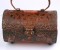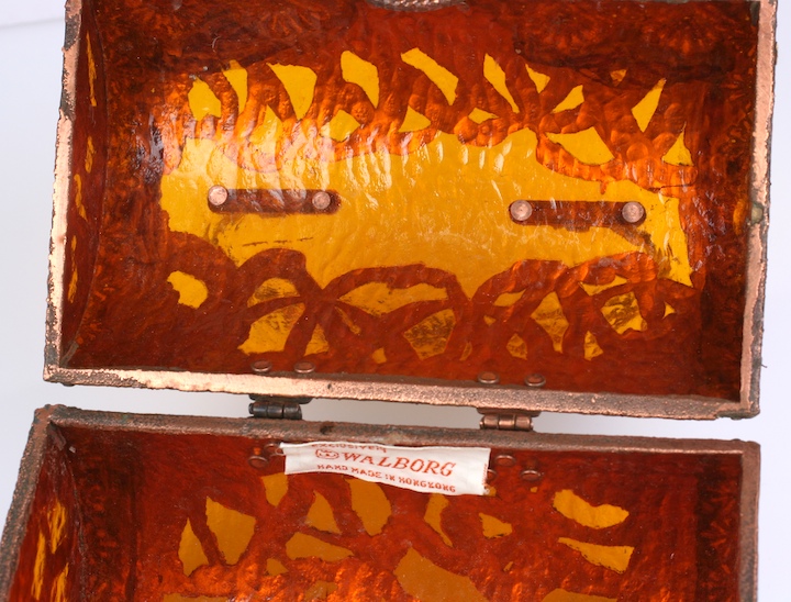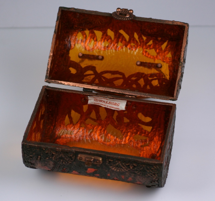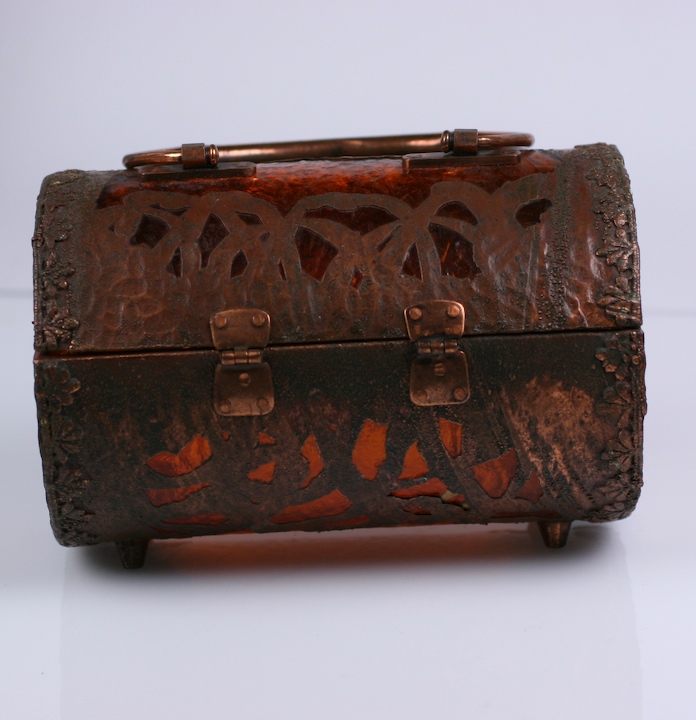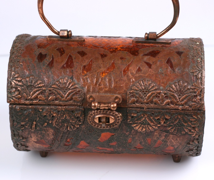 Unusual hard bag by Walborg of martele burnt orange lucite hand "clad" with copper Art and Crafts patterns. Extremely strange and ugly in a 70's mash up way, almost like a light fixture with a handle.
