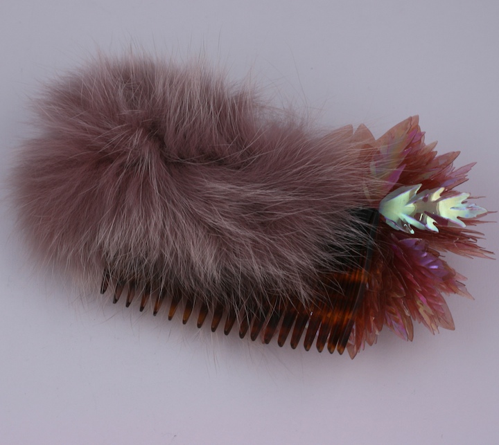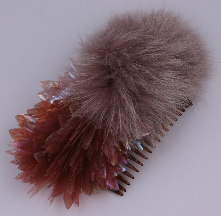Large hair ornament of dyed fox and iridescent leaf sequins from the 1980's. Strange but interesting contrast of textures. 6" x 3". 1980's USA. Excellent condition.