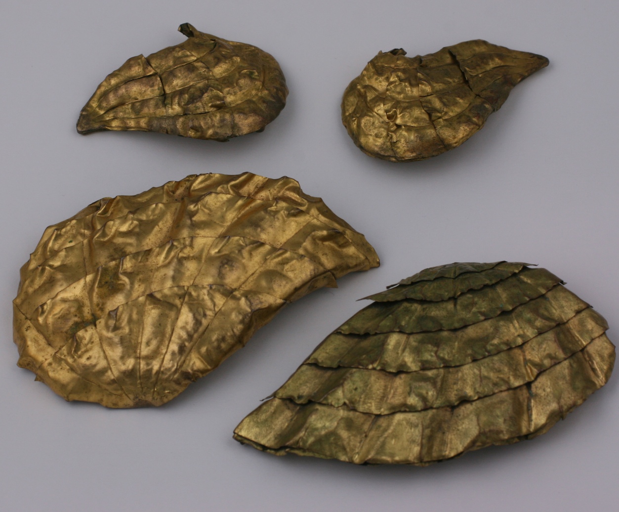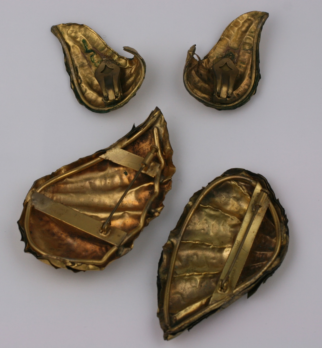 Italian Brutalist parure of hand made and hand cut gilt metal formed into abstract sea shells brooches and earclips.