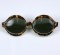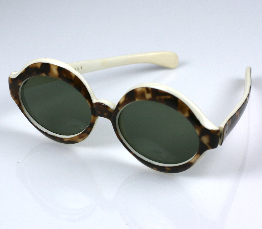 Updating...Italian sunglasses of faux Tortoise edged and lined in white plastic. Glamour from the 1950's. 5.5" wide x 2.25" high, Arm 5". Italy 1950's