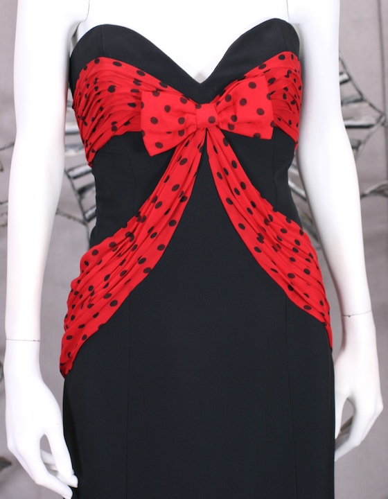 Navy strapless dress by Moschino with draped polka dot chiffon scarves which encircle the body and end on a trailing flourish on the center back. Size 44, 10 USA. Back zip entry.