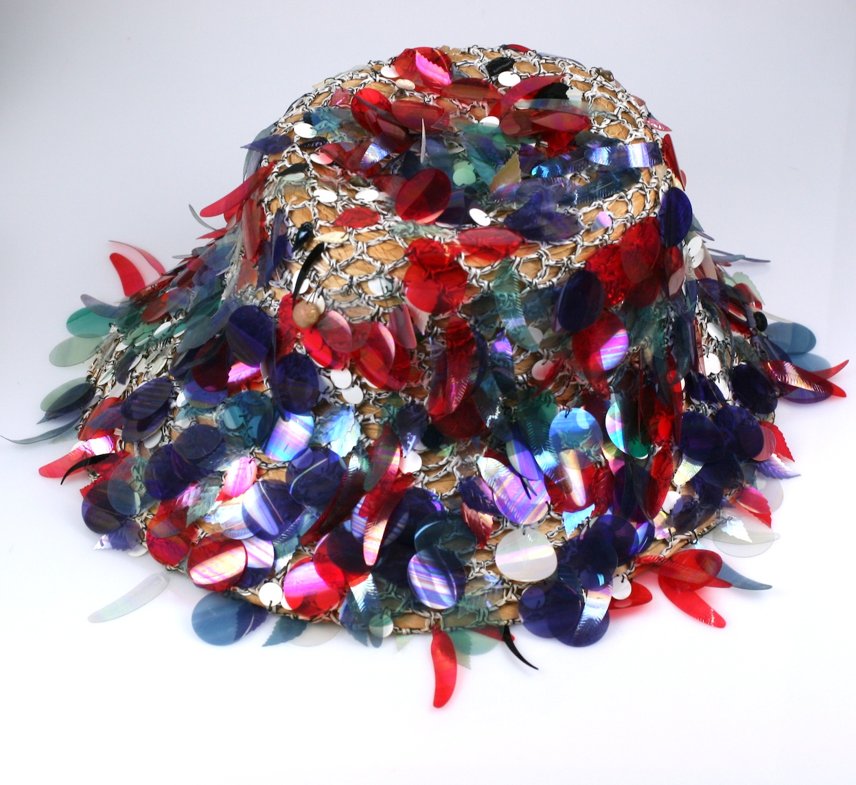 Italian Spangled Straw Sun Hat from the 1950’s with netting which has sea shells, paillettes and iridescent spangles densely applied. Fun Dolce Vita style hat, everything sways with the breeze. 1950’s Italy. Excellent condition.
