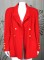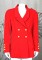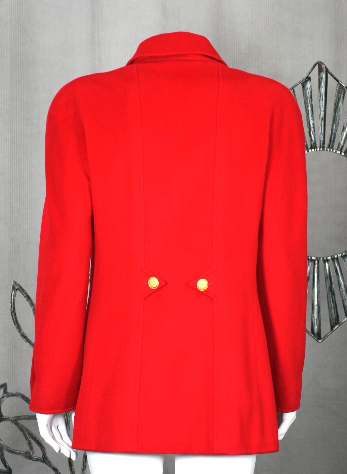 Chanel Red Cashmere Jacket by Karl Lagerfeld. Signature stand away collar with military detailing, gold logo buttons, slash pockets and tight sleeves falling from rounded shoulders. Hip length, fitted through waist. Silk logo lining. Size 38 Eu. 1990's France.
