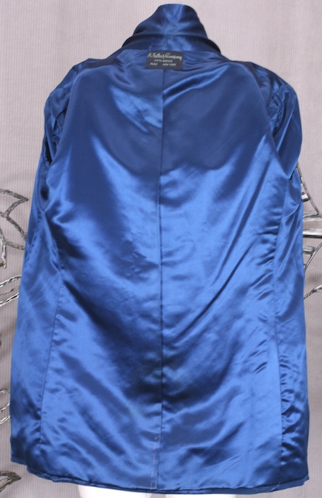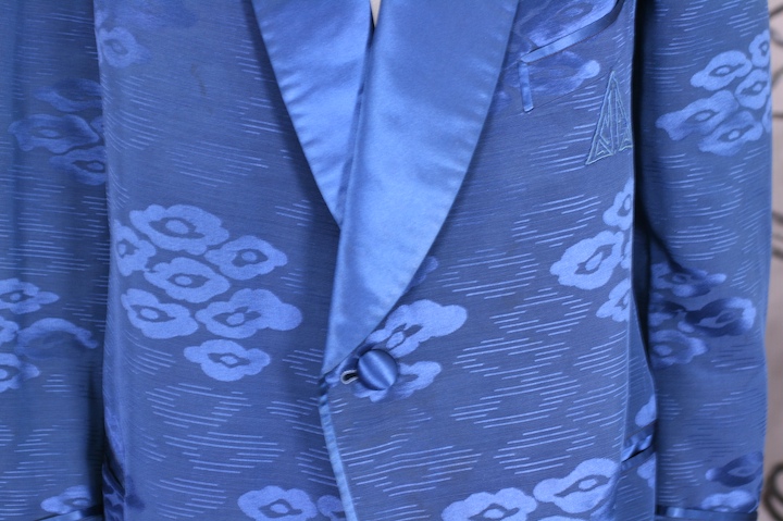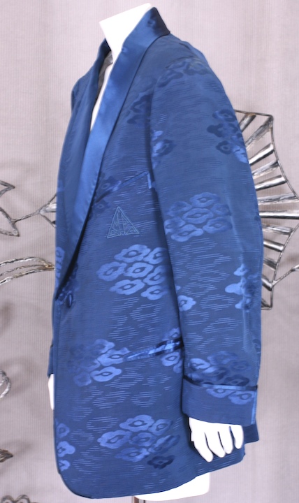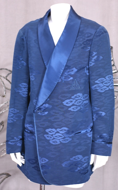 Deep royal blue silk smoking jacket in an asian cloud pattern. Completely lined in royal blue silk satin. Beautifully tailored with satin shawl collar and piping by Sulka, NY.
