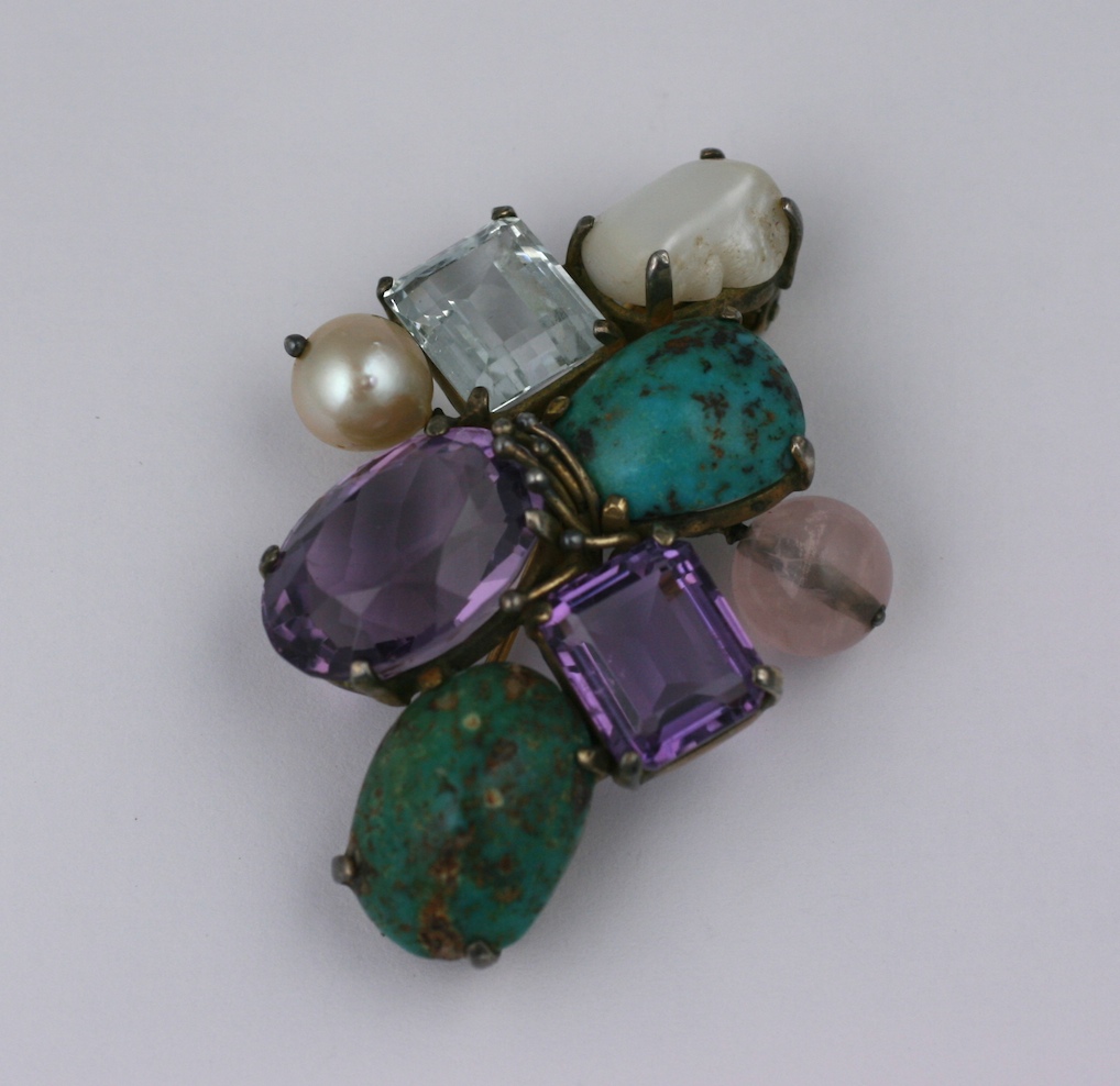 Artisan handmade gemstone clip of genuine semiprecious stones with large amythests, turquoises, aquamarine, rose quartz and pearls. Set in gilded silver. 1950's USA.