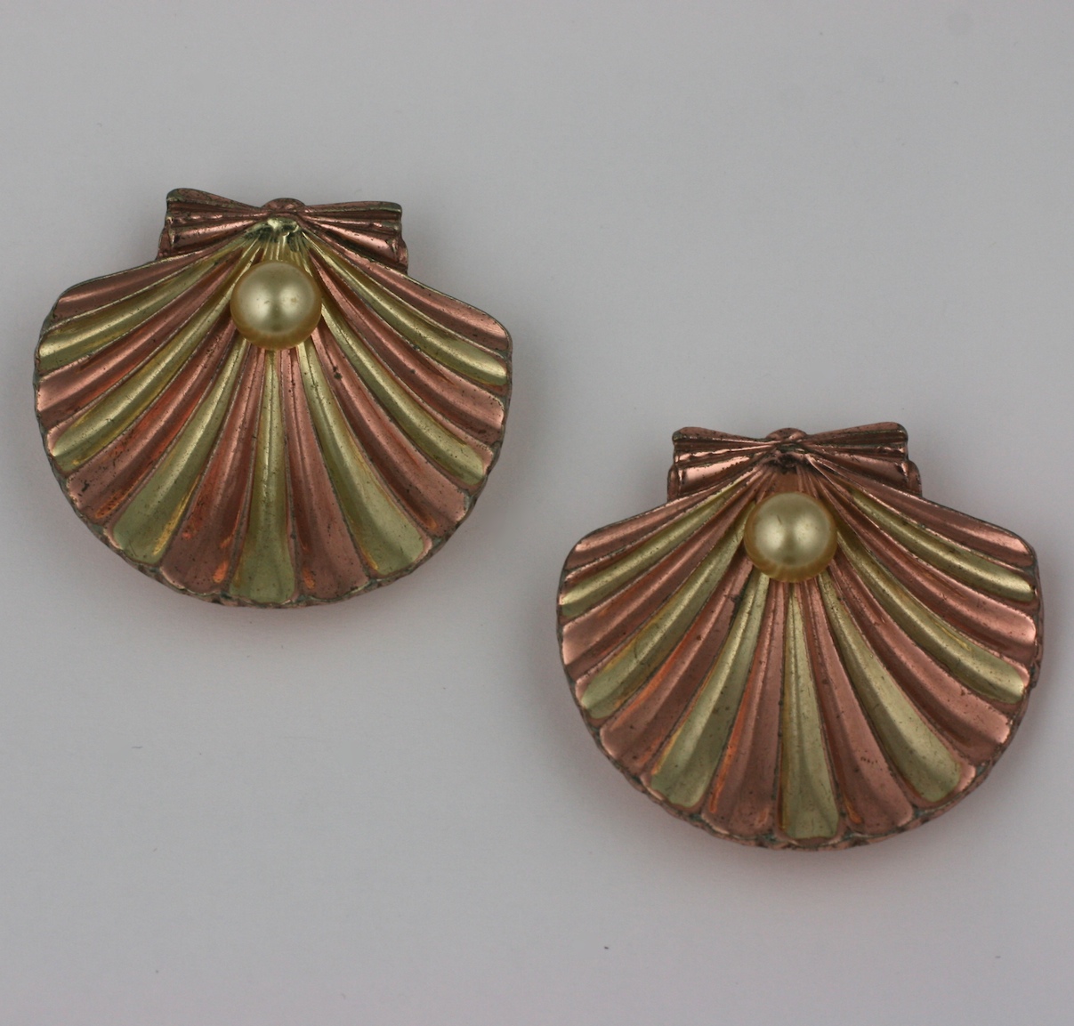 Elegant Trifari retro two tone pink gold and yellow gold striped scallop fur clip brooches with faux pearls. 1.5" x 1.4". 1940's USA.