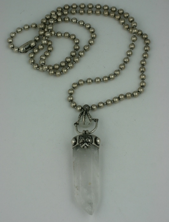 MWLC Dog Crystal Pendant with a vintage terrier, studs and rock crystal set on a silvered bronze 34" ball chain. The pendant measures 4" and swings from a fractured rock crystal bead held by a eagle talon claw. Cool, unique and twisted mashup of all the elements we love to return to, season after season. Collection: Jurassic Anime