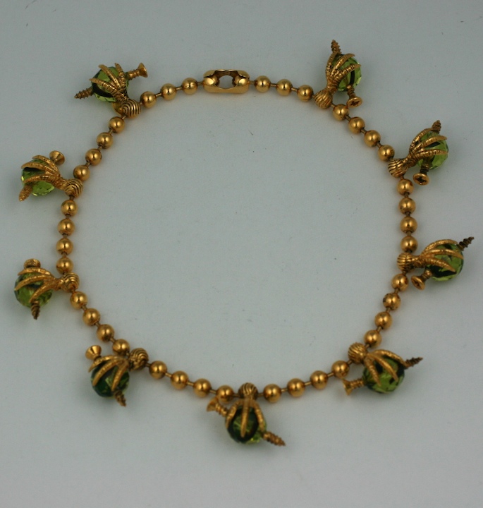 MWLC Neo Victorian Claw Collar of Gilt Metal and Antique Tiger's Eye Vaseline Glass Beads which glow under Black light. Our 21 Century version of a Victorian collar. 16.5" Ball Chain.