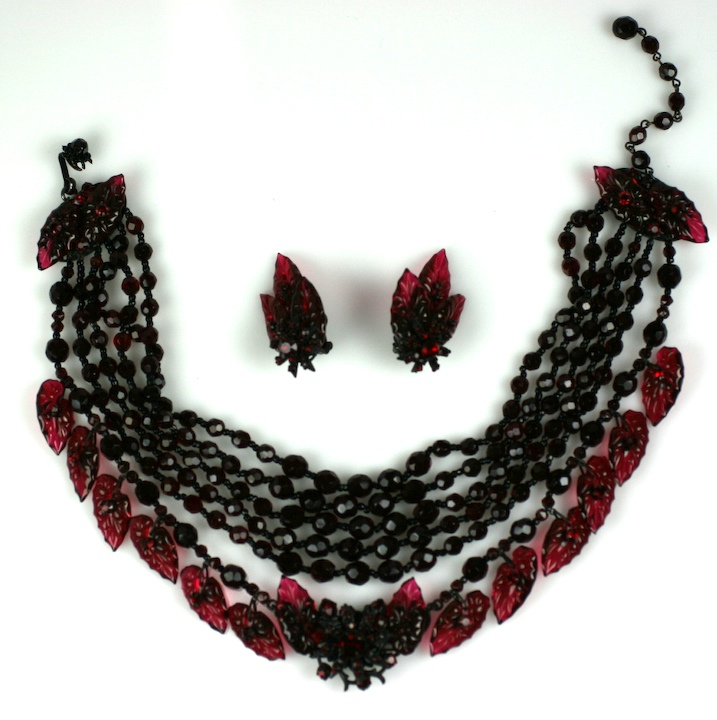 Exceptional ruby leaf Miriam Haskell of pate de verre beads and molded leaf "stones". Set in blackened metal throughout with ruby Swarovski stones. 6 strands of facetted beads with the last strand adorned with molded glass ruby leaves and paste pendants. The ornate clasp is decorated in the same way.