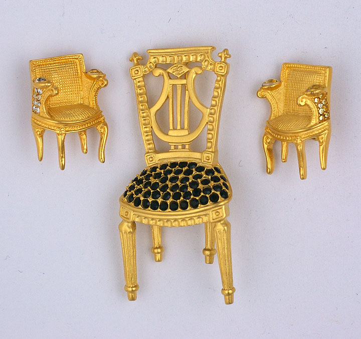 Playful iconic brooch and earring set by Karl Lagerfeld.Jet and crystal stones in matte gold settings. French lyre back chair with "KL" logo with matching side chair clip earrings. Cabochon crystals form armrests on earrings.