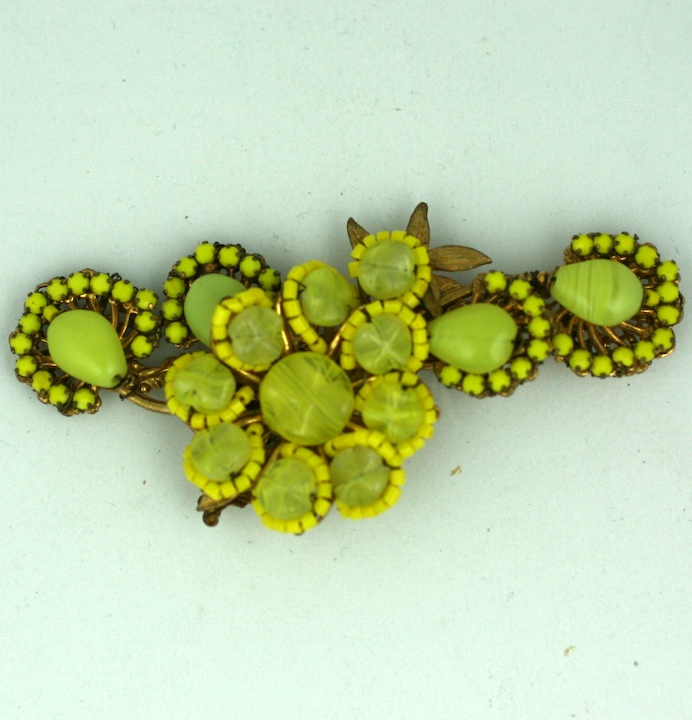 Miriam Haskell's limencello hued pate de verre brooch with signature ornate hand embroidered bead work. Large scaled brooch in amazing condition from the 1940's USA. Amazing color. 3.75" x 2".