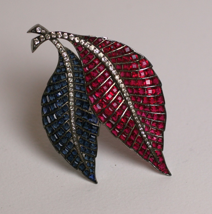 Amazing French Art Deco clip with invisibly set faux rubies and sapphire pastes, reminiscent of the leaf clips commissioned by the Duchess of Windsor. Set in Sterling with french poincon hallmarks. 3.5" x 2". 1930's France.