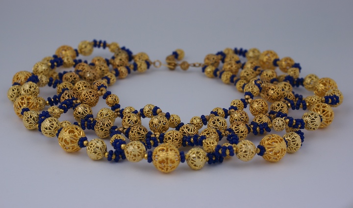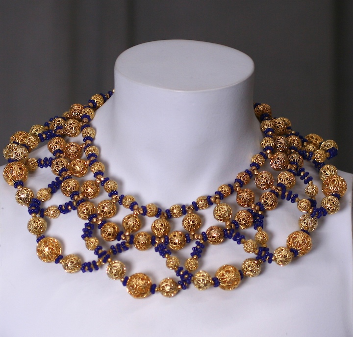 Large collar composed of gilt filigree balls and deep blue pate de verre spacers and gilt beads. Large loops of beads emanate from the central strand on neck. 1960's USA.
