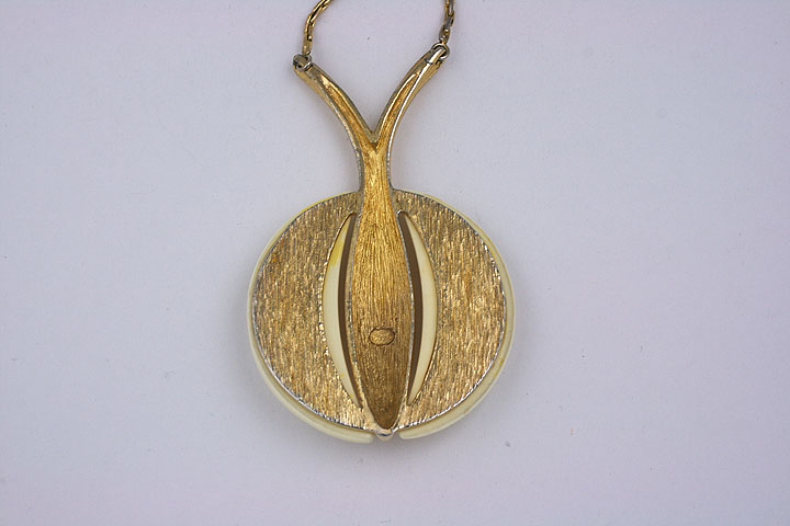 Grosse bakelite and gilt metal abstract fruit pendant. Ivory bakelite striking pendant. 1970s. Germany.