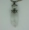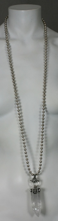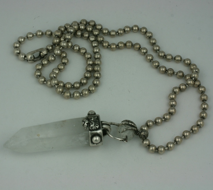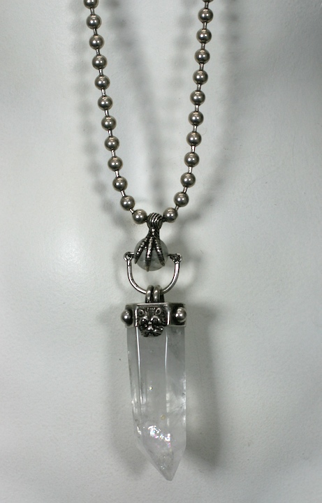 MWLC Dog Crystal Pendant with a vintage terrier, studs and rock crystal set on a silvered bronze 34" ball chain. The pendant measures 4" and swings from a fractured rock crystal bead held by a eagle talon claw. Cool, unique and twisted mashup of all the elements we love to return to, season after season. Collection: Jurassic Anime