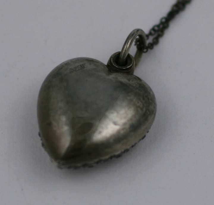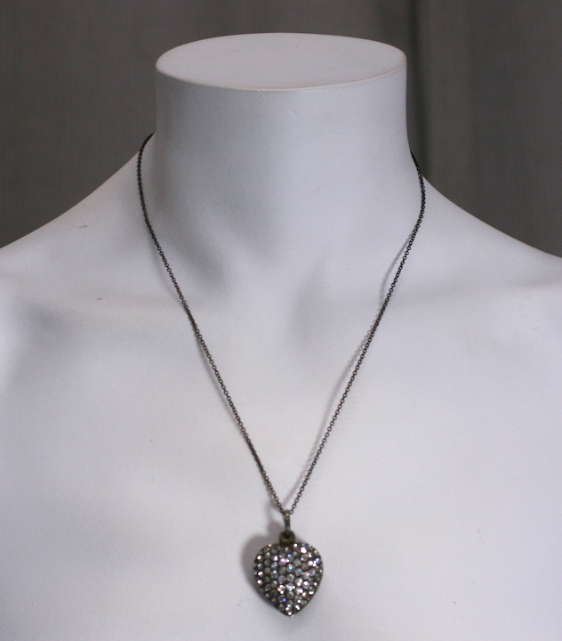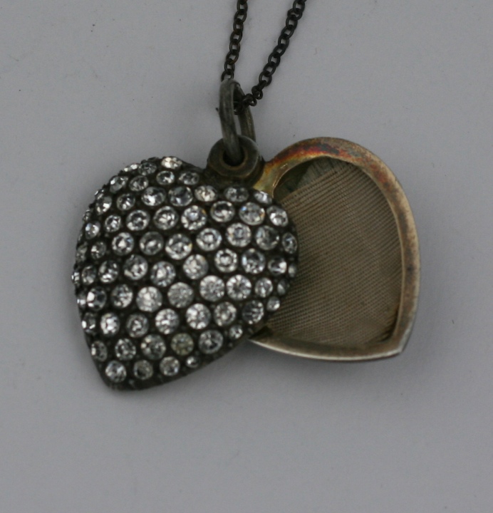 Attractive puffy 3-D heart from the late 19th Century set with dozens of clear pastes. The locket is a slider so photos can be worn outward or hidden toward yourself. 1890s USA. Set in Sterling Silver on darkened silver chain. 1" wide with 18" chain.