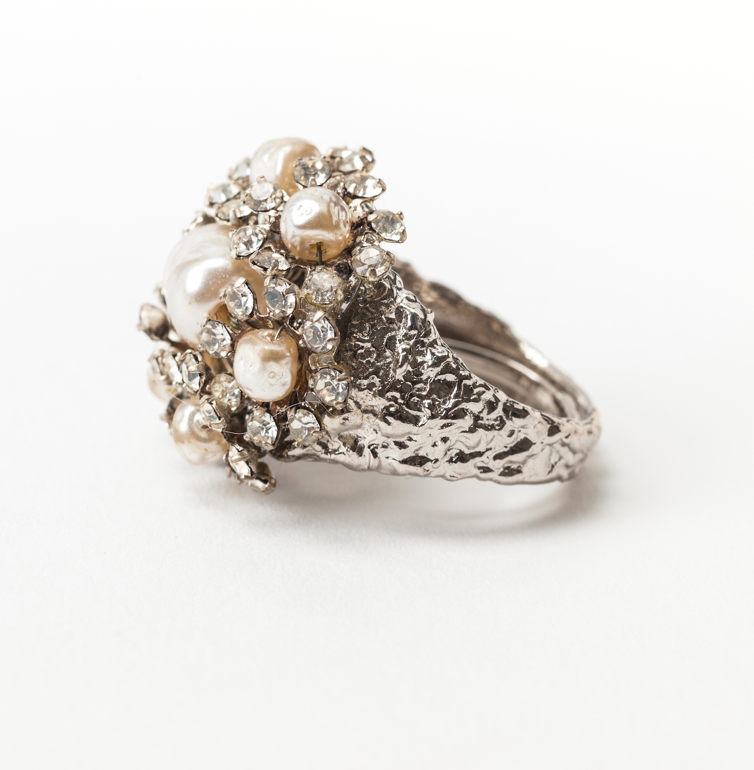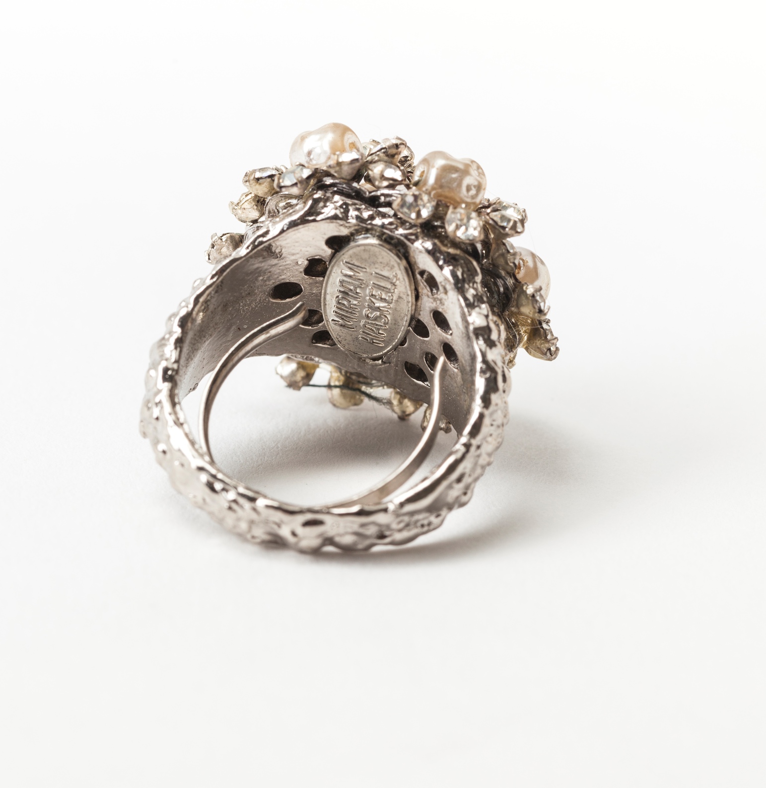 Miriam Haskell silver gilt and faux pearl and pave cluster ring. 1950's USA.