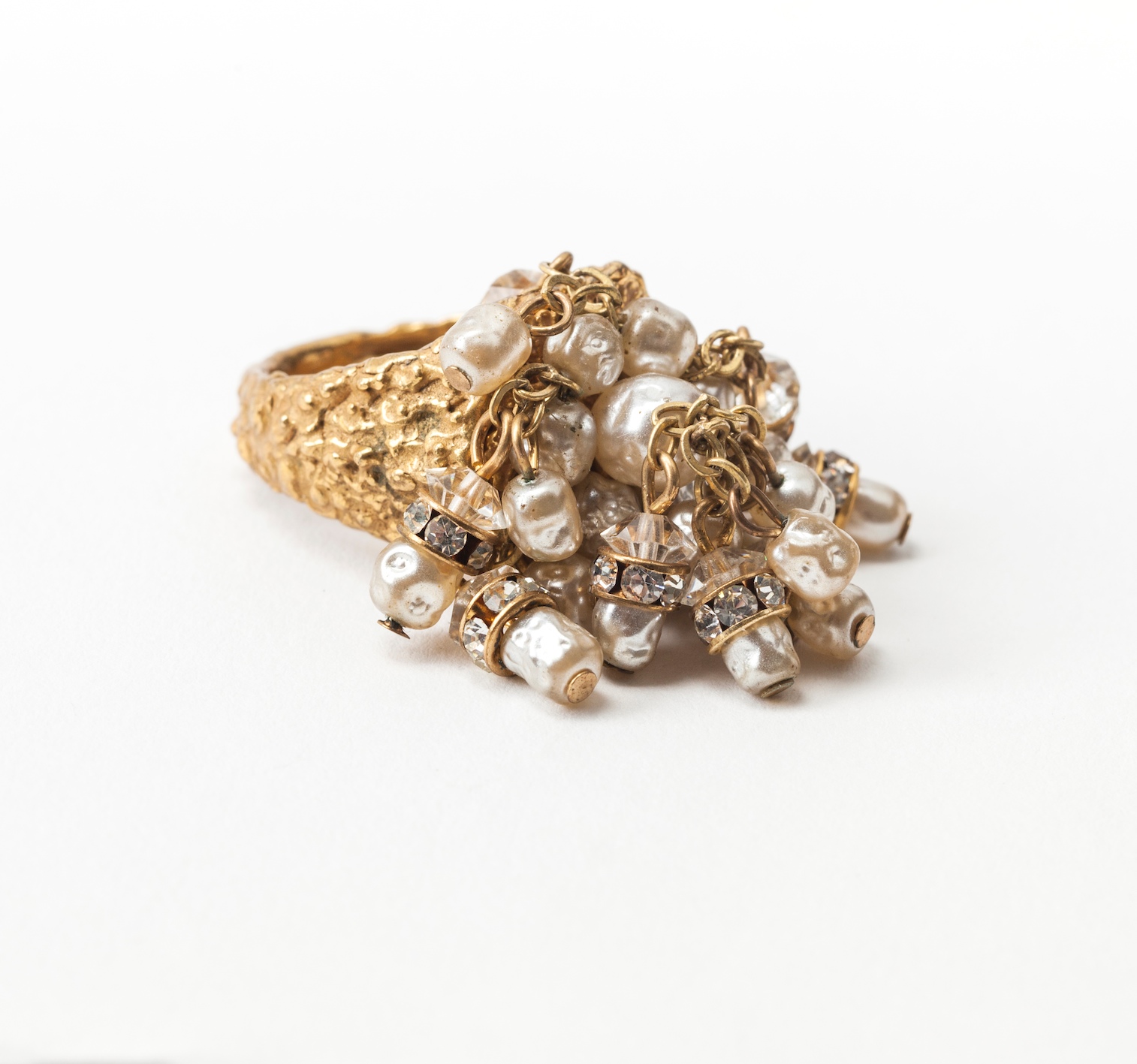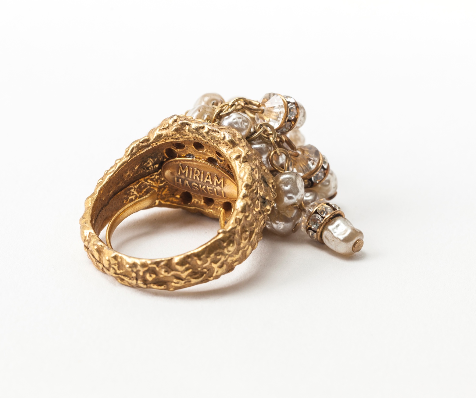 Updating...Miriam Haskell signature baroque pearl and crystal rondelle, textured Russian gilt cocktail ring. Adjustable band inside ring. 1950's USA. Excellent condition