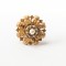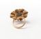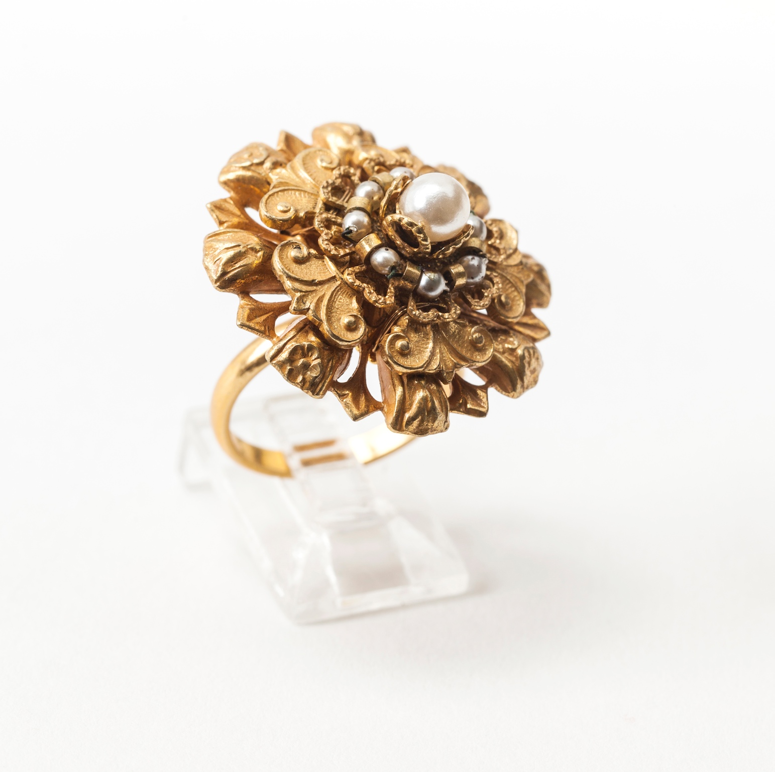 Miriam Haskell flowerhead ring of Russian Gilt filigree with signature faux baroque and smooth pearl embroidery. Adjustable band.
