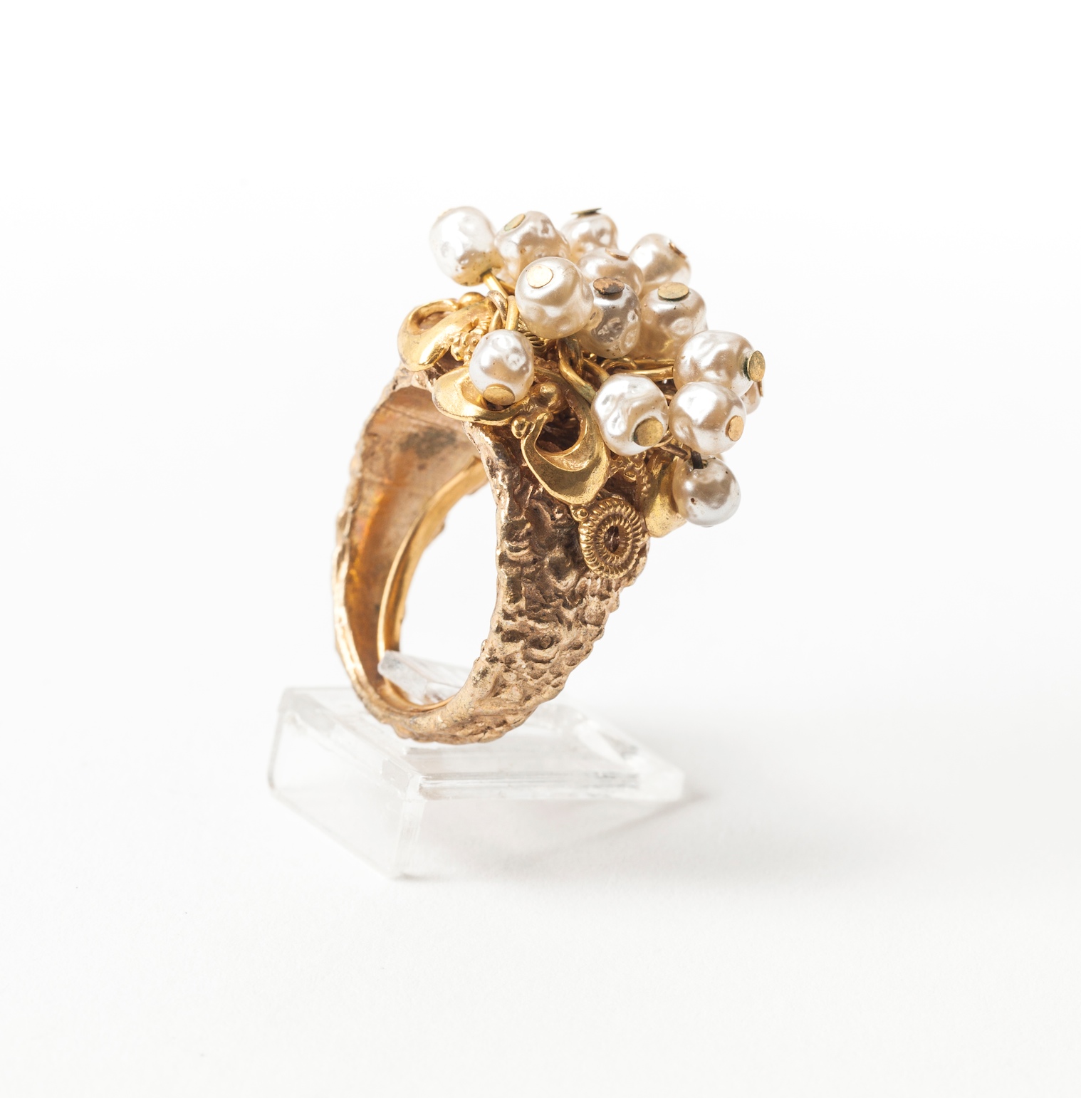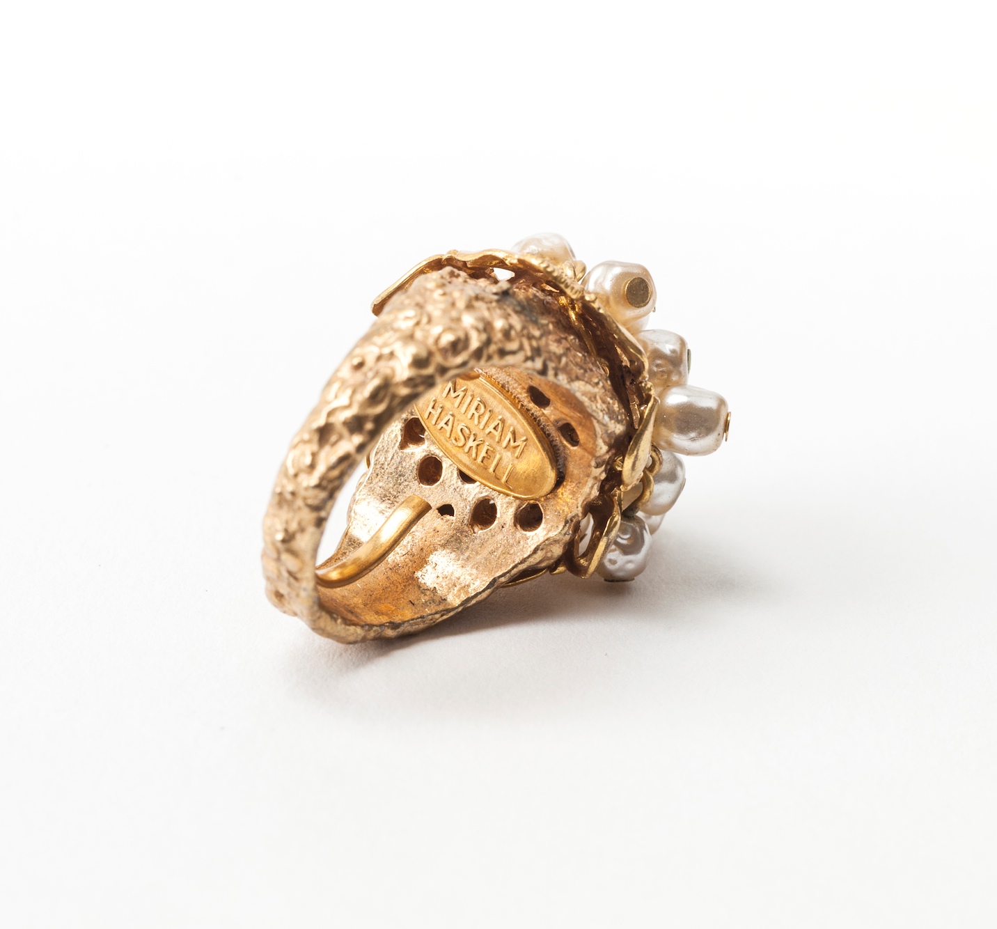 Miriam Haskell signature baroque faux pearl fringe cocktail ring of Russian gilt martele metal and filigree. Adjustable interior band. 1950's USA. Excellent condition.