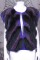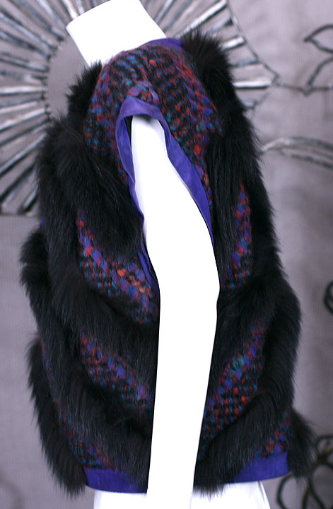 Revillon all seasons square cut woven mohair, suede and fox gilet. Deep 12" slash armholes allow movement. Woven mohair in teal, black and wine woven with purple suede strips. Completely edged in purple suede with chevron patterned black fox fur. Worn open with no closures.Black silky lining.