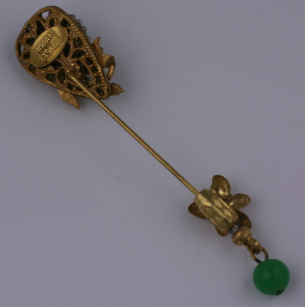 Miriam Haskell's Russian gold plate stickpin brooch of faux jade pate de verre, rose montes crystals, and finely sewn seed pearls. Excellent condition. 1940's USA.