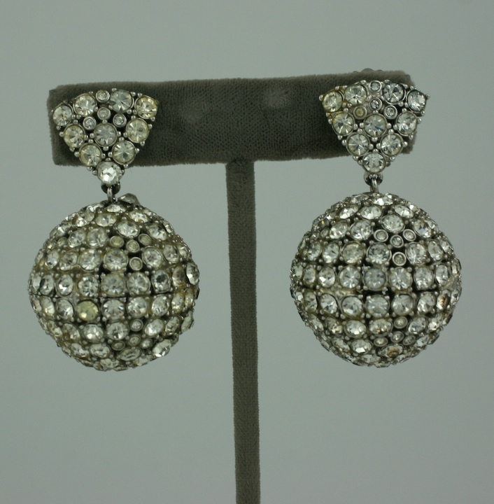 Schiaparelli's pave orb earclips of faceted crystals which are set in silvered metal with clip back fittings.