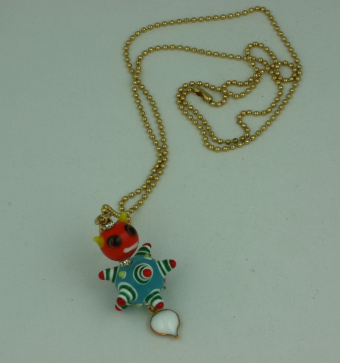 Our charming little Nikki Monster pendant of multicolor glass, pave rondels with a poured glass heart. Made in France for Mark Walsh Leslie Chin. 30″ gilt ball chain.