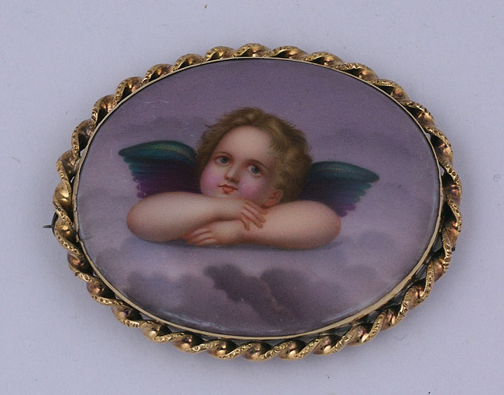 Charming Victorian brooch from the late 19th Century. A cherub perched in the clouds is transfer printed onto porcelain and is set into a twisted and textured 14K gold surround. A modern closure has replaced the original and is ultimately more secure. A small loop on top of brooch can be converted for a pendant as well. 1880’s.