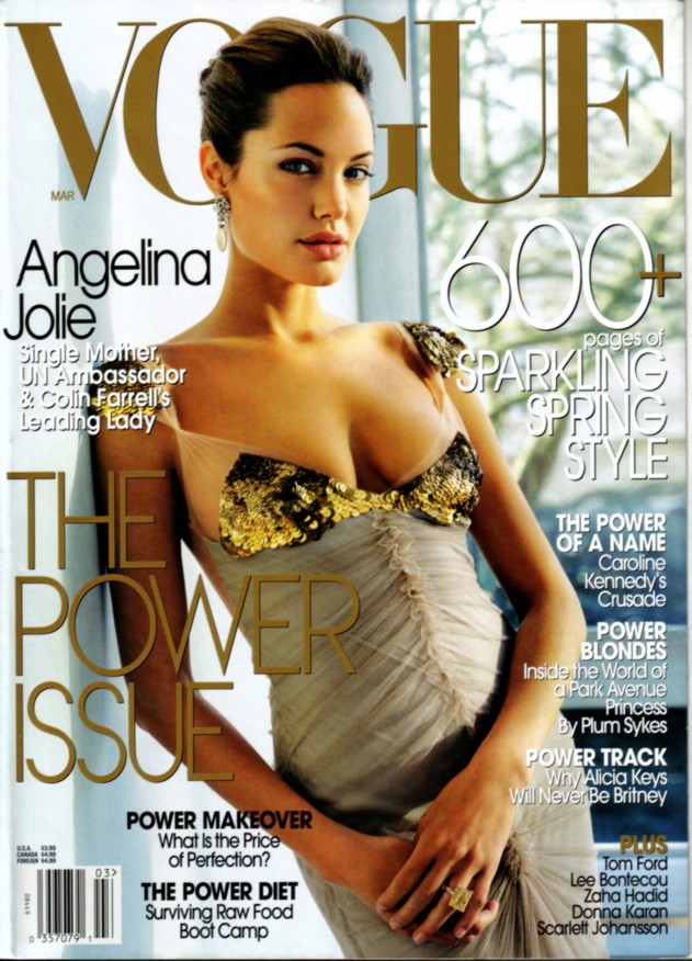 Vogue, March 2004 Posted on March 31, 2004May 13, 2014 by LeslieAngelina Jolie in Vintage Luxury’s Miriam Haskell Freshwater Pearl Earrings.